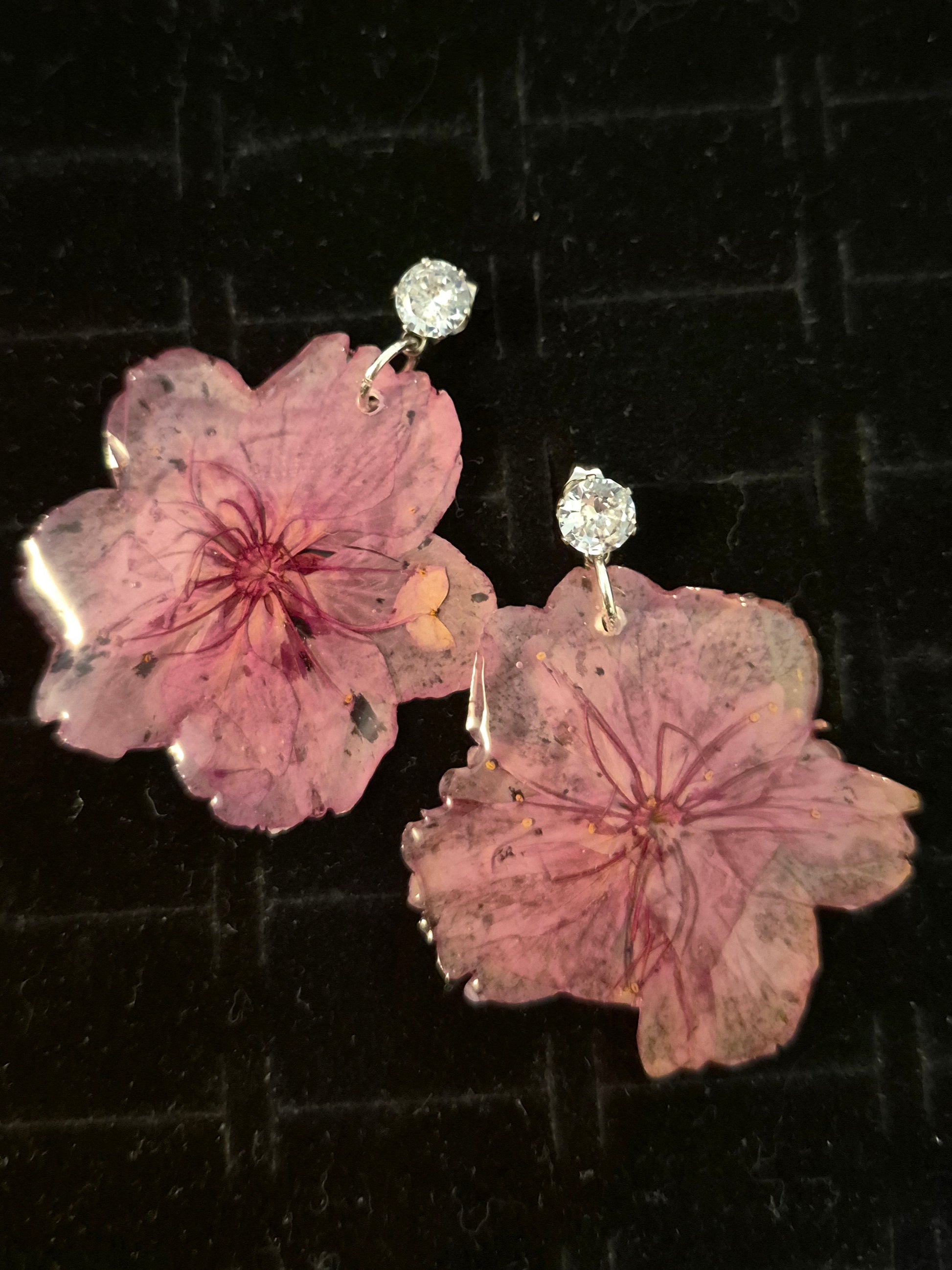 Örhängen med torkade japanska körsbärsblommor och uv resin. Blomma ca 4cm i diameter. Stift I rostfritt stål.