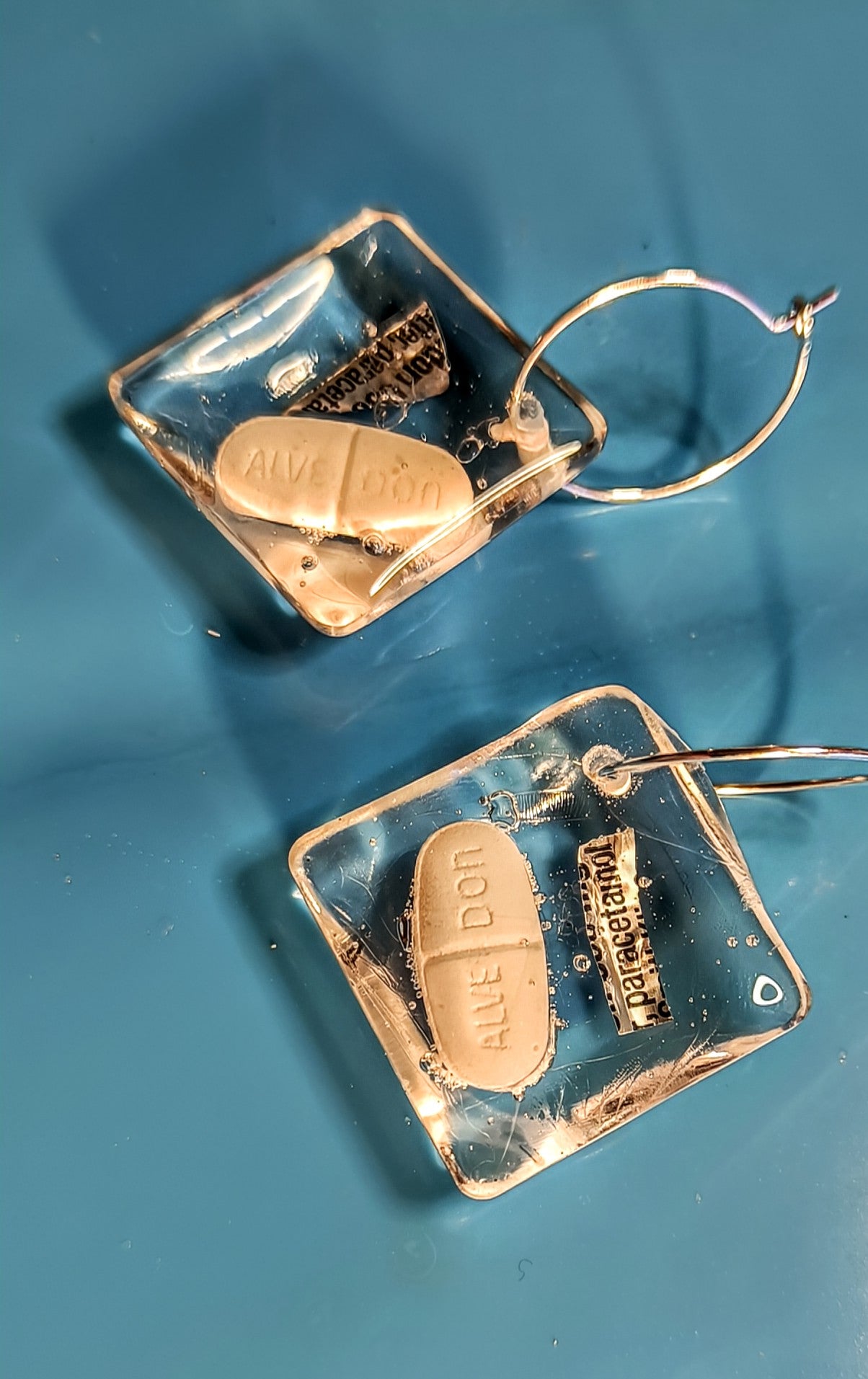 Örhängen i UV resin med Alvedon i.