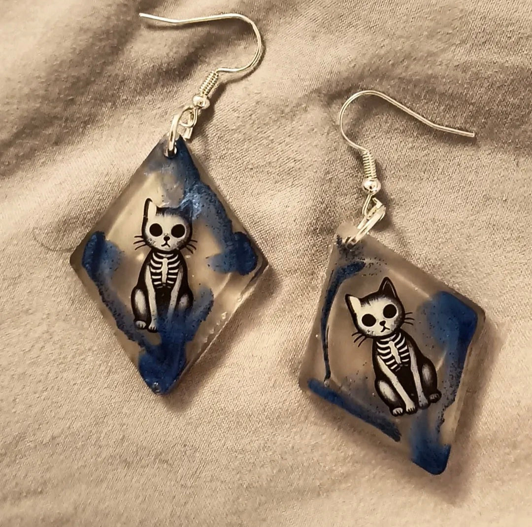 Halloweeninspirerade örhängen med blå micapulver och kattskelett.