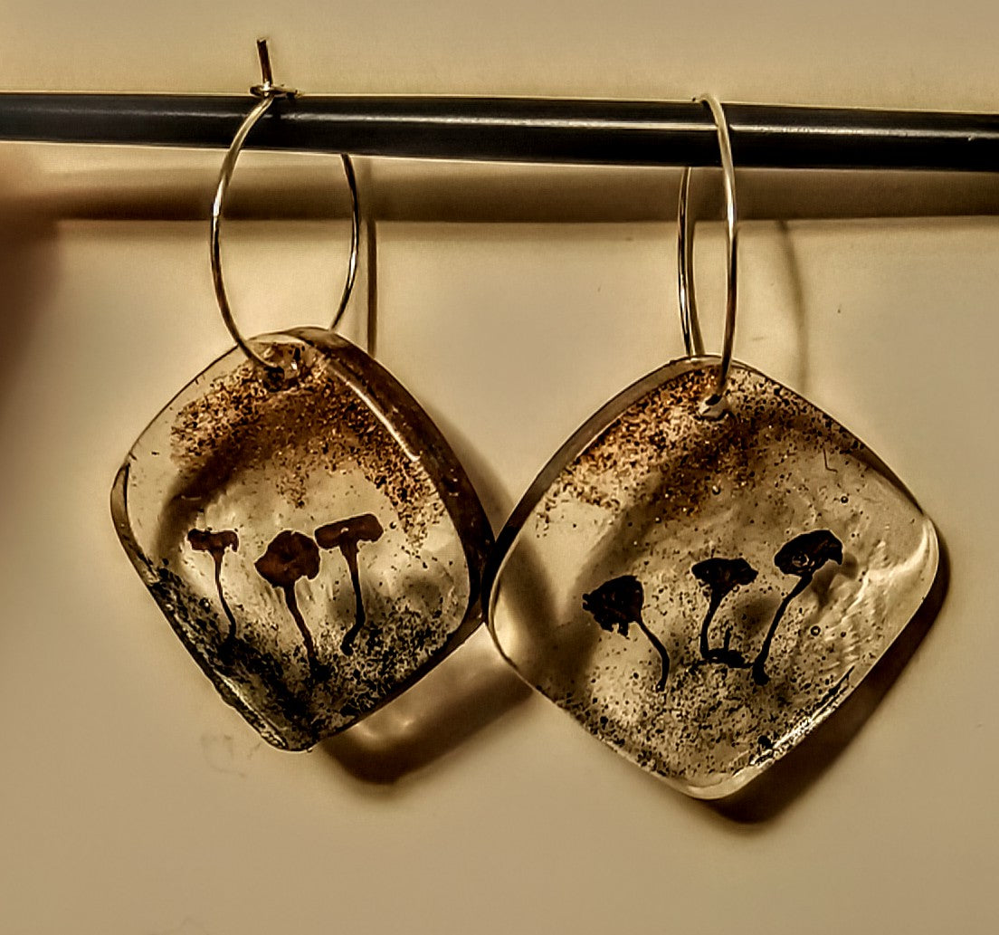 Örhängen i UV resin med torkade svampar.